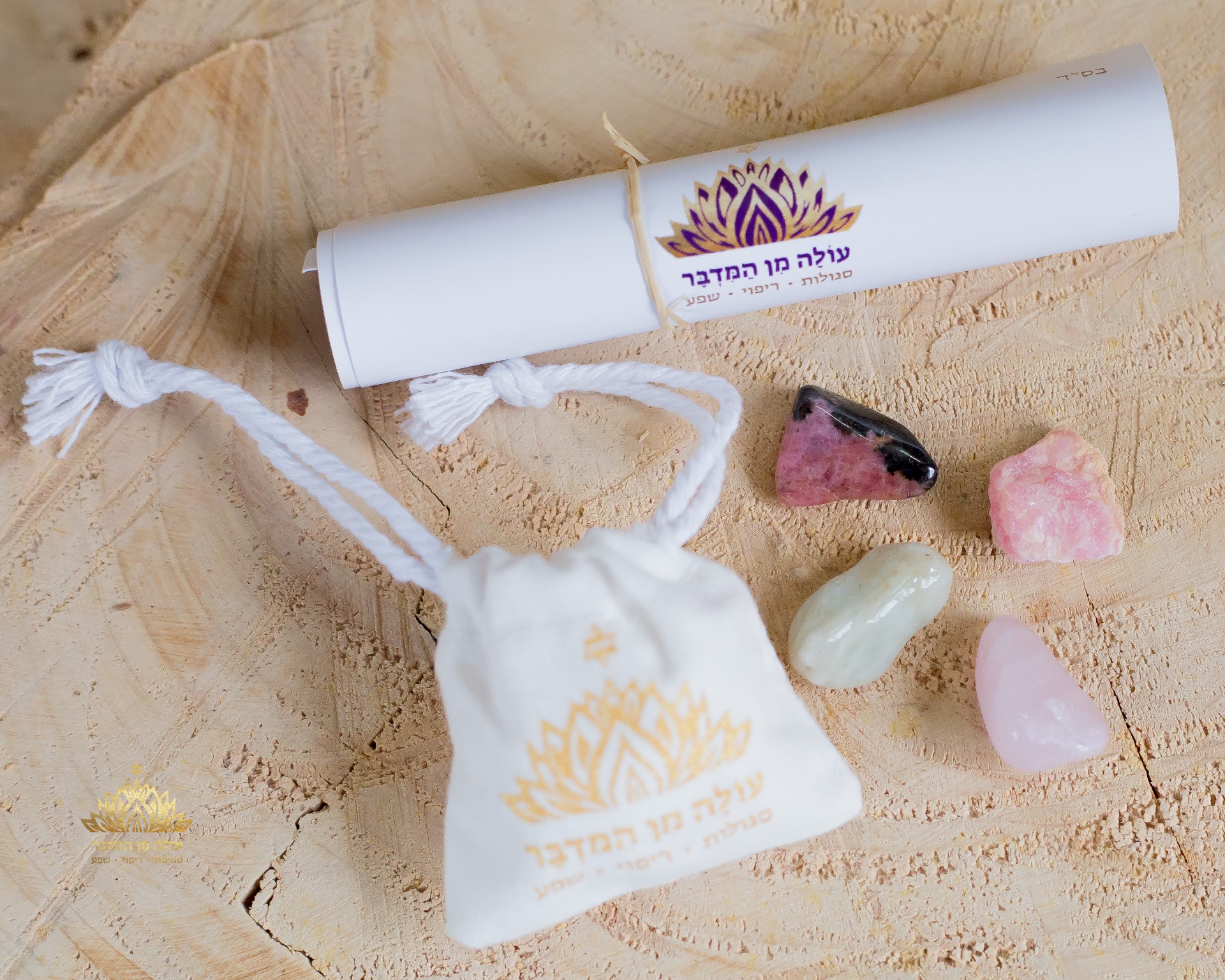 - ערכת האבנים ארוזה בשקית כותנה ובקופסה קטנה.